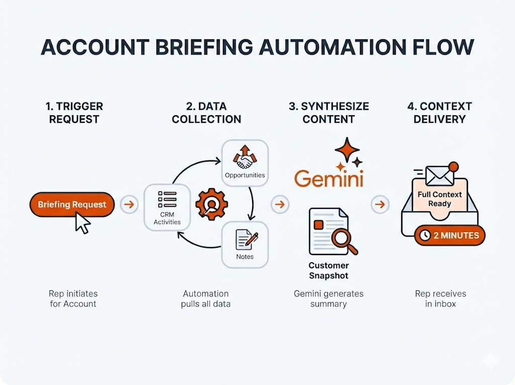 The problem: Rep has a customer call in 30 minutes. They need context.