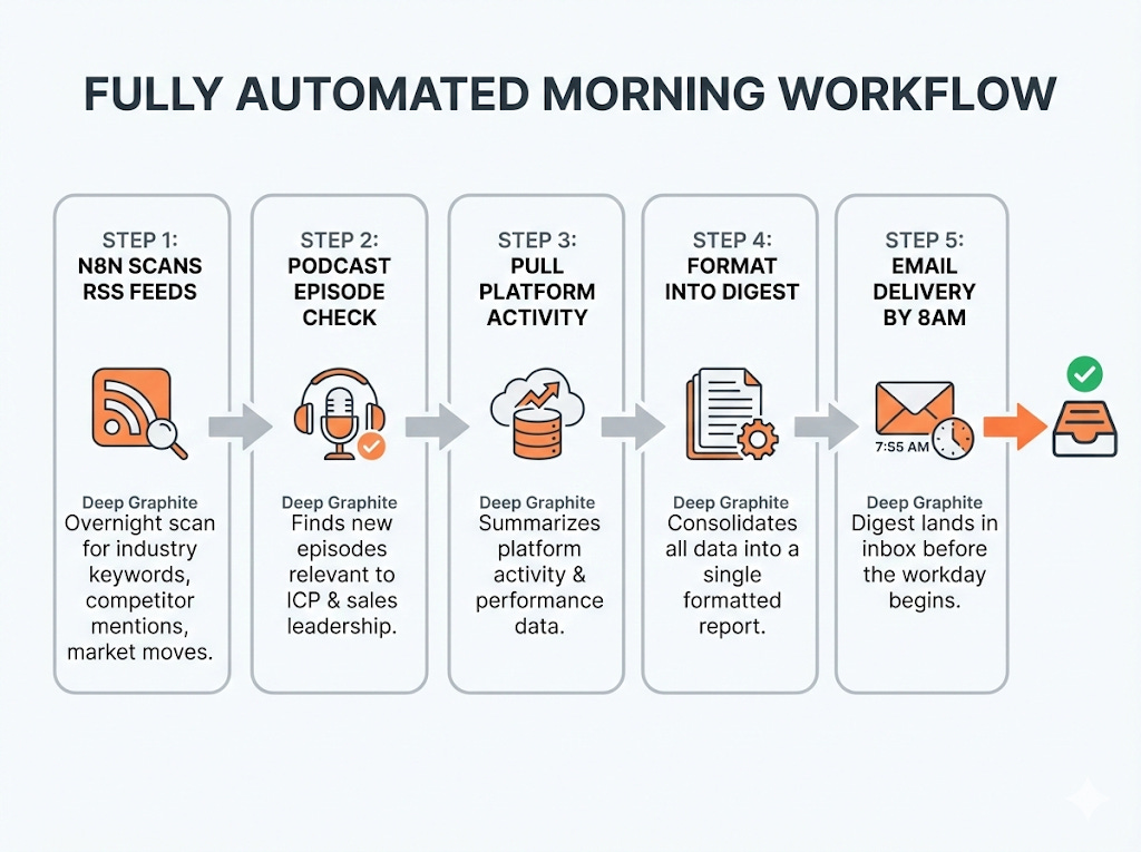 N8N scans RSS feeds overnight—industry keywords, competitor mentions, market moves