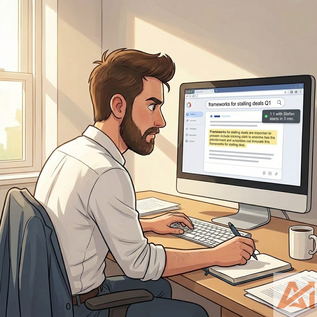 When a rep struggles with discovery questions, I search my NotebookLM: “discovery frameworks from the last 3 months.” I get back specific tactics from specific episodes. I share the best one in our 1:1. We try it together the following week.