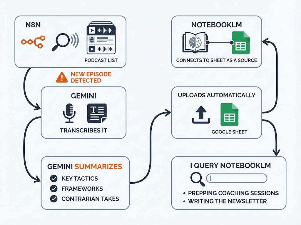 The payoff: In 3 months, you’ll have a searchable database of hundreds of sales tactics. Your coaching gets sharper. Your content gets easier. And you never missed an episode—even though you didn’t listen to any of them.